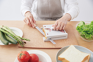 スライサーの溝にパン切りナイフでスライス。