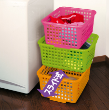 積み重ねてもスライド式だから、上のカゴを降ろさずに下の物が取り出せます。